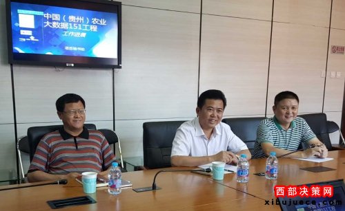 中國農(nóng)科院農(nóng)業(yè)信息研究所副所長王文生(左一)、貴州省銅仁高新技術(shù)開發(fā)區(qū)管委會主任寇啟聰(中)與中國網(wǎng)大數(shù)據(jù)門戶網(wǎng)總裁謝金明(右一)聽取工程進展匯報