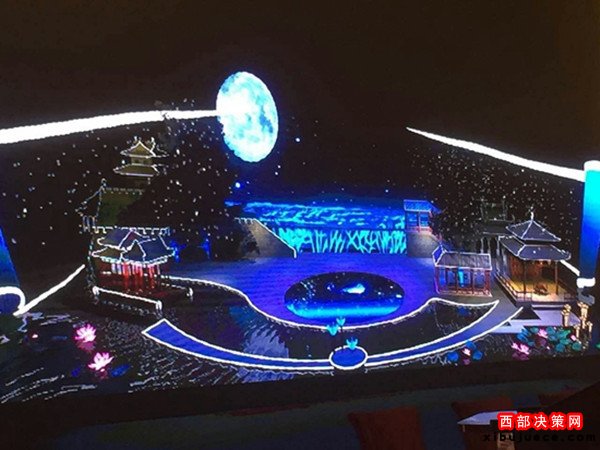 今年秋晚的舞美設(shè)計(jì)制作本著厲行節(jié)約的原則,對(duì)演播現(xiàn)場(chǎng)現(xiàn)有的實(shí)景建筑做了最大化的利用。晚會(huì)以中國(guó)目前最大的仿唐建筑群紫云樓為觀眾席背景,在廣場(chǎng)一側(cè)的人工景觀湖上搭建舞臺(tái)。舞臺(tái)主體通過(guò)一幅展開(kāi)的中國(guó)傳統(tǒng)畫(huà)軸形象,將西安城墻和大明宮角樓等元素有機(jī)地結(jié)合到一起,實(shí)現(xiàn)臺(tái)在水上、水在臺(tái)中的夢(mèng)幻效果,營(yíng)造出一種穿越千年、貫通古今的浪漫。