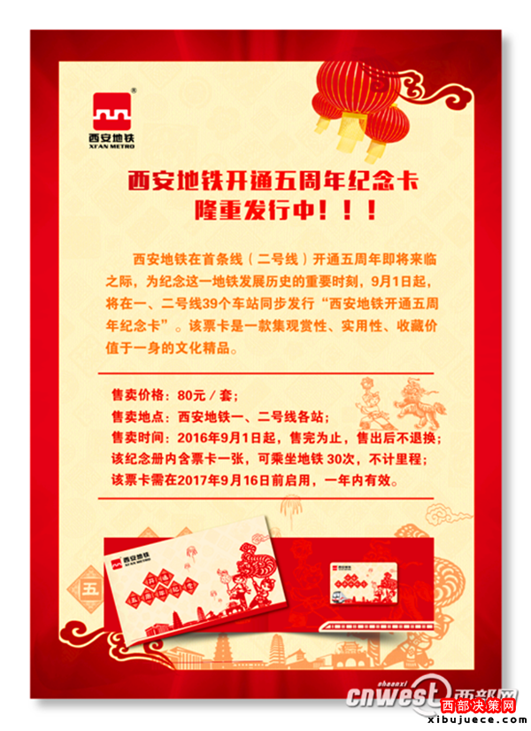 9月1日起,西安地鐵將在一、二號線39座車站同步發(fā)行“西安地鐵開通5周年紀(jì)念卡”,售價(jià)80元。