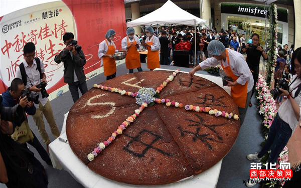 2016年9月3日,在云南昆明一購物中心展出了一個直徑約2.4米的巨型月餅。這個巨型月餅是以火腿、食用玫瑰等材料純手工制作而成,總重量達上百斤。