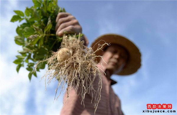9月28日,在定西市隴西縣德興鄉(xiāng)營(yíng)門(mén)村,一位農(nóng)民展示受旱情影響導(dǎo)致不足雞蛋大小的馬鈴薯。