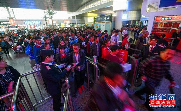 10月7日,乘客在鄭州火車站內準備進站乘車。