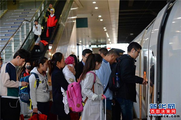 10月7日,旅客在沈陽北站排隊上車。當日是國慶長假的最后一天,外出游玩、探親的旅客陸續(xù)返程,各地迎來返程客流高峰。