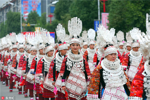 2016年10月11日,貴州省黔東南劍河縣城少數民族同胞身著節(jié)日盛裝巡游,歡慶仰阿莎節(jié)。當日,劍河縣在縣城舉行隆重的仰阿節(jié)文化節(jié)暨縣城搬遷10周年慶?;顒?,此次活動為期三天10月10日至12日。