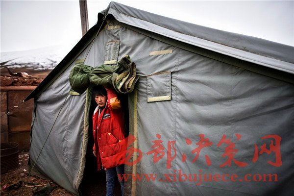 10月18日,雜多縣阿多鄉(xiāng)多加村受災牧民尕瑪代文站在安置帳篷門口。