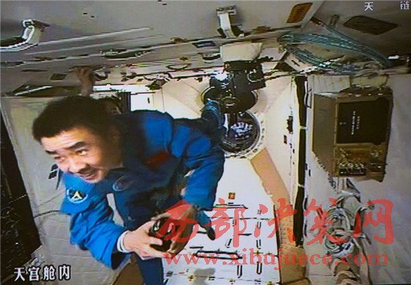 10月19日,神舟十一號(hào)航天員景海鵬和陳冬順利進(jìn)入天宮二號(hào)實(shí)驗(yàn)艙。這是景海鵬(左)和陳冬在天宮二號(hào)實(shí)驗(yàn)艙(攝于北京航天飛行控制中心大屏幕)。