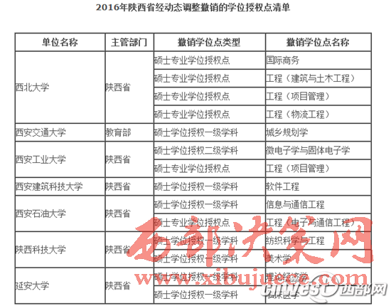 2016年陜西省經(jīng)動(dòng)態(tài)調(diào)整撤銷的學(xué)位授權(quán)點(diǎn)清單包括,西北大學(xué)的國際商務(wù)、西安交通大學(xué)的城鄉(xiāng)規(guī)劃學(xué)等7所大學(xué)的14個(gè)碩士專業(yè)學(xué)位授權(quán)點(diǎn)和碩士學(xué)位授權(quán)一級學(xué)科。