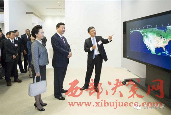 2015年9月23日,習(xí)近平參觀(guān)美國(guó)微軟公司總部。這是習(xí)近平夫婦觀(guān)摩大數(shù)據(jù)可視化系統(tǒng)展示。新華社記者蘭紅光攝