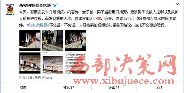 11月14日下午,在許多西安市民的朋友圈傳播幾段視頻,內容為一女子被一男子當街用刀捅死,后該男子被數人控制以及救護人員救護過程。經西安網警鑒定,該案件為11月12日發(fā)生在貴州省的案件,并非西安。