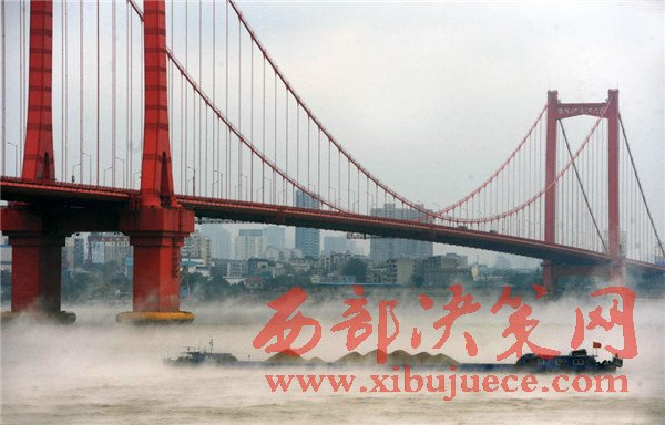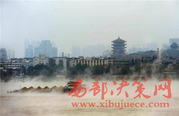 2016年11月23日,湖北武漢,寒潮帶來極速降溫后,由于江水溫度較大氣溫度高出不少,長江江面上出現(xiàn)層層水霧,煙波浩渺,蔚為壯觀,放眼望去,仿佛整個城市都漂浮在云霧之中。