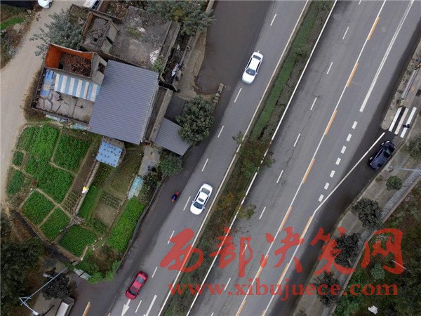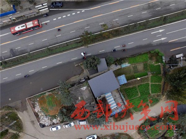 這棟房子屋前的院壩、自留地占據(jù)了進(jìn)方向的兩條車道。2008年擴(kuò)建這條路之前,這棟民房就已經(jīng)立在這里,至今已有8年時(shí)間。