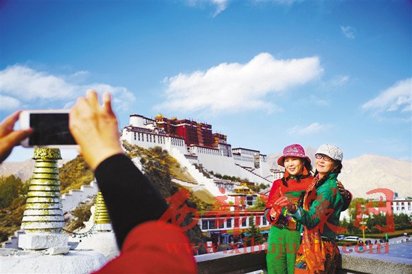 圖為游客在布達拉宮觀景臺拍照留念。