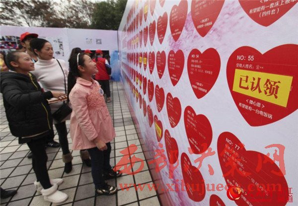 02-愛(ài)心墻前,市民和學(xué)生在看需要認(rèn)領(lǐng)的微心愿。