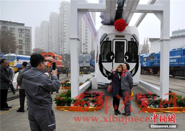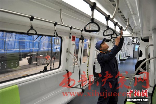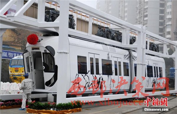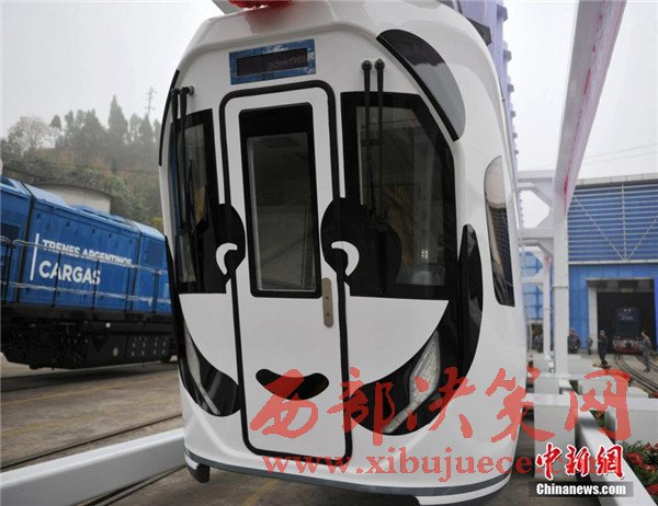 記者在現(xiàn)場看到,正式下線的空鐵車身為卡通熊貓山水圖案,酷似“熊貓”,每列定員144人,時(shí)速最高可達(dá)65公里。列車采用“大容量動(dòng)力蓄電池充放電控制技術(shù)”,通過實(shí)現(xiàn)高倍率放電,提高列車起動(dòng)加速性能及對(duì)極限環(huán)境的適應(yīng)性,同時(shí)能將400千瓦的電制動(dòng)功率全部用于動(dòng)力電池快速充電,實(shí)現(xiàn)制動(dòng)能量回收再利用,延長蓄電池續(xù)航里程達(dá)120千米。圖為車身外繪制有熊貓山水圖案。