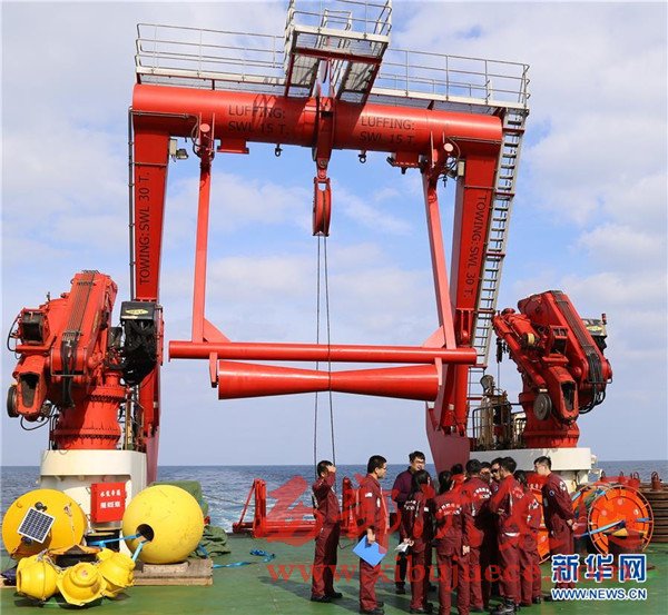 科考隊員在回收潛標(biāo)(11月15日攝)。我國遠(yuǎn)洋綜合考察船“科學(xué)”號正在西太平洋執(zhí)行潛標(biāo)觀測網(wǎng)維護(hù)與升級任務(wù)。截至目前,科考隊員已獲取了140余件觀測設(shè)備連續(xù)1年的現(xiàn)場數(shù)據(jù),維護(hù)了8套深海潛標(biāo),并重新布放至西太平洋海域。