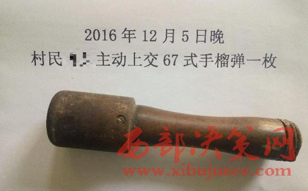 紫陽東木鎮(zhèn)村民冉某來到東木派出所,主動上交了一個自己一直用來砸核桃的物件,民警一看吃了一驚,這個東西竟然是67式手榴彈!民警立即進行了檢查,該手榴彈雖然沒有拉火裝置,但是不能確定彈體內(nèi)是否還有炸藥。
