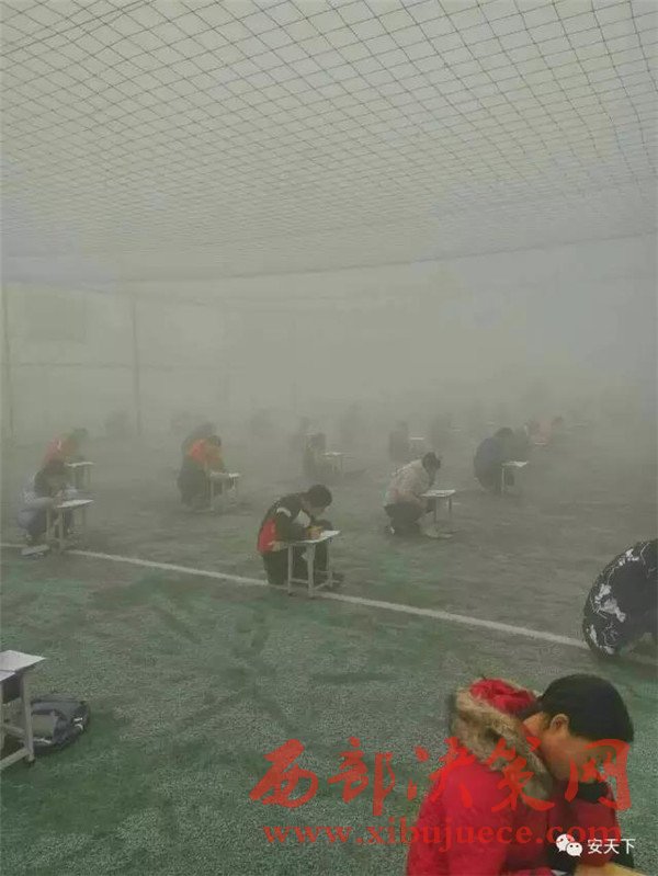 連日來,安陽地區(qū)空氣嚴(yán)重污染,空氣污染指數(shù)連續(xù)爆表,林州市教體局下發(fā)了全市中各中小學(xué)、幼兒園停課通知。然而,昨日上午,大河報記者接到林州市臨淇鎮(zhèn)一中學(xué)生家長的投訴電話稱,在這種霧霾天氣,該校不僅沒有給孩子放假,還組織幾百名學(xué)生在操場上進(jìn)行考試。
