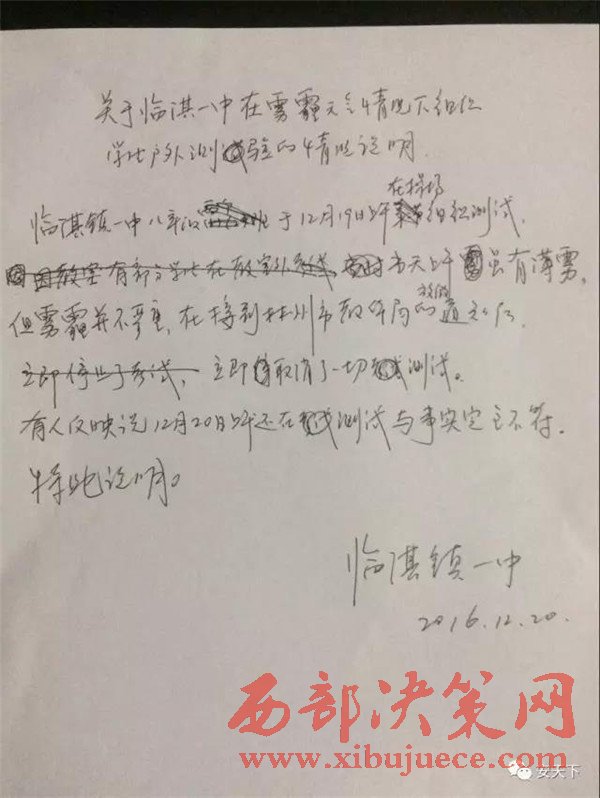馮校長出示了一份手寫的情況說明:臨淇鎮(zhèn)一中八年級于12月19日上午在操場組織測試,當(dāng)天上午雖有薄霧,但霧霾并不嚴(yán)重,在接到林州市教體局的通知后立即取消了一切測試。有人反映說12月20日上午還在測試,與事實完全不符。特此說明。“為什么有學(xué)生說19日下午也考試了?”記者追問,并說出了考試的科目。馮校長尷尬地笑笑:“組織都組織了,就考完吧。”據(jù)馮校長介紹,當(dāng)時并沒有這么多學(xué)生在操場考試,有一部分學(xué)生在教室考的,在操場上考試的只有480多名學(xué)生。到底是什么樣的考試如此急迫,讓學(xué)生頂著霧霾也要進(jìn)行?馮校長說,學(xué)生課講完了,這次考試是一個摸底測驗考試,也沒有那么急迫。