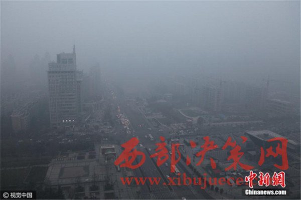 2016年12月19日,鳥瞰西安城市,霧霾籠罩,不太遠(yuǎn)的建筑也幾乎被霧霾“吞噬”,看不到一點(diǎn)影,當(dāng)日早八點(diǎn),空氣質(zhì)量指數(shù)達(dá)409,為嚴(yán)重污染。 圖片來源:視覺中國(guó)