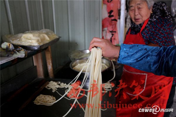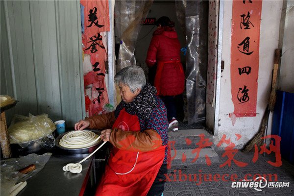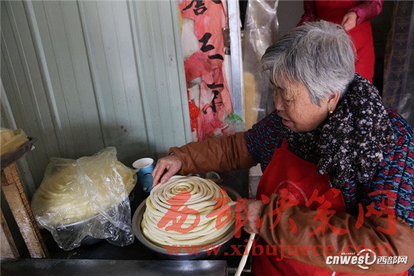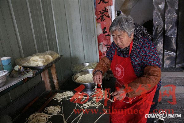 西安南二環(huán)附近的一條小巷里,新安醫(yī)院門(mén)口,70歲的賀玉蘭老人和兒媳劉艷寧在她們的實(shí)惠面館里忙碌著,揉面、拉條子、下面、給食客端面,婆媳倆默契得就像一個(gè)人,“二人成一心,黃土變成金。” 賀玉蘭老人喜歡老家蒲城的這句老話(huà)。