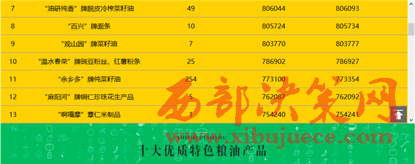 余慶縣大涼山米業(yè)有限責(zé)任公司的“大涼山”香米,貴州赫章縣黔豐蕎業(yè)有限公司的“黔豐”牌苦蕎系列產(chǎn)品,印江土家族苗族自治縣騰飛米業(yè)有限責(zé)任公司的“大圣墩”牌大米,貴州油研純香生態(tài)糧油科技有限公司的“油研純香”牌脫皮冷榨菜籽油,納雍縣百興鎮(zhèn)白泥屯特色產(chǎn)品有限公司的“百興”牌面條,貴州省貴定縣古鎮(zhèn)香糧油有限公司的“觀山園”牌菜籽油,習(xí)水縣春榮食品加工廠的“溫水春榮”牌豌豆粉絲、紅薯粉條七個(gè)產(chǎn)品也憑借優(yōu)異的表現(xiàn)躋身前十。遵義地區(qū)糧油產(chǎn)品占據(jù)前十名三個(gè)席位,黔南、畢節(jié)、銅仁各有兩個(gè)糧油產(chǎn)品躋身前十,六盤水一個(gè)產(chǎn)品入圍十強(qiáng)。
