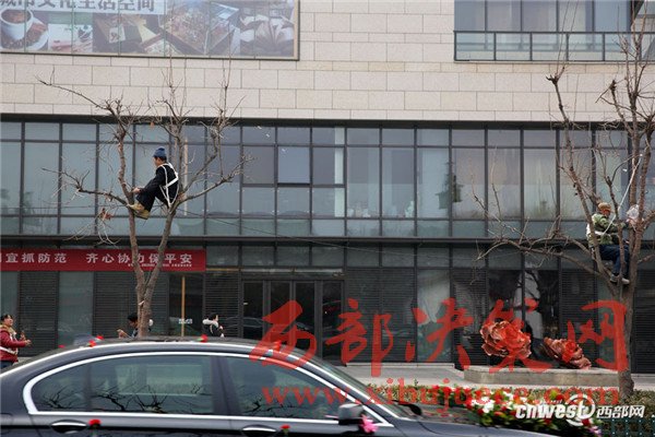 12月24日,西安市曲江新區(qū)芙蓉南路、雁塔南路,不少工人爬到樹上綁彩燈。一名正在樹上往樹枝上一圈一圈纏繞彩燈的師傅說:“綁一棵樹的彩燈一人得花半天到一天時(shí)間。”