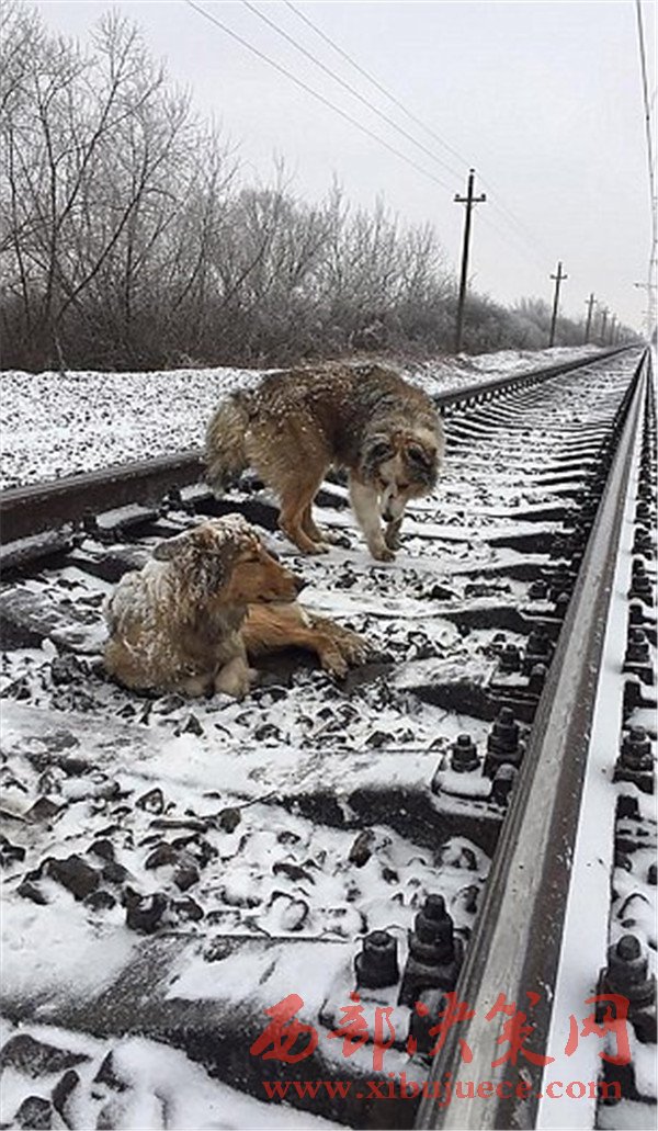 在嚴(yán)寒中,兩只狗狗在鐵軌上蜷縮了兩天,一動不動。Lucy受傷嚴(yán)重,沒法從鐵軌上挪動下來。Panda一直在她身邊保護她,用自己的身體為她保溫,當(dāng)有火車逼近時,Panda想盡辦法把Lucy的頭按下,讓火車可以在它們頭頂經(jīng)過。
