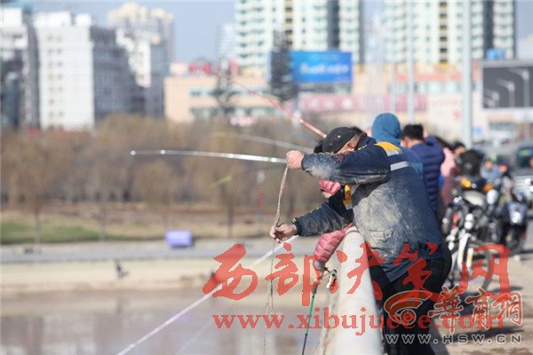 咸陽(yáng)湖橡膠壩附近,滿是捕魚(yú)和撈魚(yú)的人。