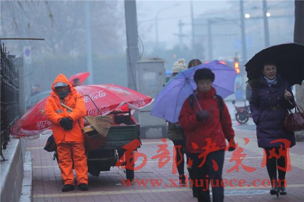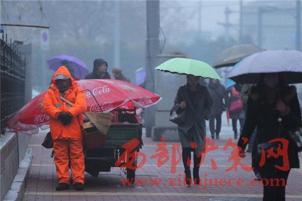 2016年12月26日一早,山東濟南,天空中飄著細(xì)細(xì)的雪花,一位環(huán)衛(wèi)工人靠在路邊站著睡著了,記者看到,這名環(huán)衛(wèi)工人還懷抱掃把和簸。