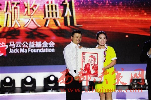 陜西獲獎(jiǎng)教師代表馮海燕送剪紙肖像給馬云