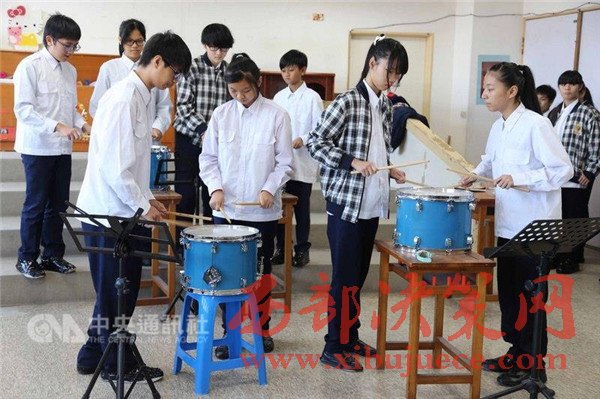 社團音樂老師趙純瓏說,打擊樂團有16名成員,原本是豎笛社團,但發(fā)現(xiàn)孩子們經(jīng)常隨著節(jié)奏拍打大腿或拍桌,非?;顫娪志咭魳诽旆?,所以這學(xué)期才成立打擊樂團。