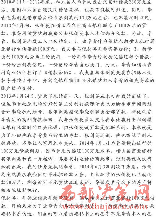 網(wǎng)友微信公眾號 江嶼濯浪爆料 2010年11月-2012年底,神木縣人李青向我岳父累計借款260萬元左右。后因神木縣出現(xiàn)民間借貸危機,該款不能按時歸還。同時,李青還高利息借市委辦秘書張劍英的130萬元左右,也不能按時歸還。2013年1月初,張劍英在橫山縣農(nóng)村商業(yè)銀行聯(lián)系了100萬元的貸款,準備用該貸款向我岳父和張劍英本人清償部分借款。為此,李青、張劍英和我三人口頭約定:1、由李青作為借款人向橫山農(nóng)村商業(yè)銀行申請借款100萬元,我夫妻與張劍英夫妻提供擔保;2、所貸出的100萬元分為三份使用,一份用作李青給我岳父償還部分借款、一份給張劍英償還,一份留給李青自己使用。為此,李青和橫山農(nóng)村商業(yè)銀行簽訂了《借款合同》,我夫妻與張劍英夫妻在擔保人處簽字并按了手印,并約定銀行將100萬元借款打入李青的姐夫高斌的賬戶視為交付。