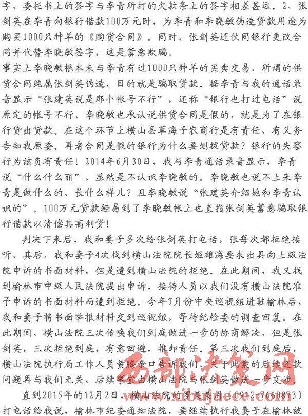 判決下來后,我和妻子多次給張劍英打電話,張每次都拒絕接聽,其后,我和妻子4次找到橫山法院院長姬雄海要求出具向上級法院申訴的書面材料,但是遭到橫山法院的拒絕。在此期間,我又找到榆林市中級人民法院提出申訴,接待人員以我們沒有橫山法院準予申訴的書面材料而遭到拒絕。今年7月份中央巡視組進駐榆林后,我和妻子將書面舉報材料交到巡視組,等待紀檢委的調(diào)查回復。在此期間,橫山法院三次傳喚我們到庭做進一步的協(xié)商解決,但是張劍英,三次拒絕到庭,有意回避,推卸責任。第三次我們到庭后,橫山法院執(zhí)行局工作人員黃騰親口告訴我們,關(guān)于此案的后續(xù)還款問題再與我們無關(guān),后續(xù)事宜由橫山法院與張劍英做進一步交涉。