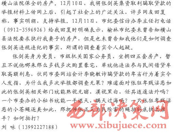 直到2015年的12月2日,橫山法院的羅某某用(0912-7660873)打電話給我說,榆林市紀委通知法院,要繼續(xù)執(zhí)行我妻子在榆林被橫山法院保全的房產(chǎn)。12月10日,我將張劍英集資取利騙取貸款的舉報材料上傳網(wǎng)上后,引起了社會上的廣泛關(guān)注,許多網(wǎng)友回復稱,事實明朗,支持舉報。12月11日,市紀委信訪辦李主任打電話(0912-3596926)給我回復時明確表示,榆林市紀委未曾告知橫山縣法院要求執(zhí)行我妻子的房產(chǎn),但是也未曾告知我他們是如何調(diào)查張劍英違規(guī)違紀的事實,所謂的調(diào)查著實令人起疑。