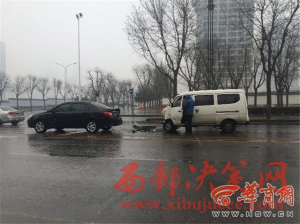 原標題:西安雪天路面濕滑面包車遇紅燈剎車不及撞上私家車