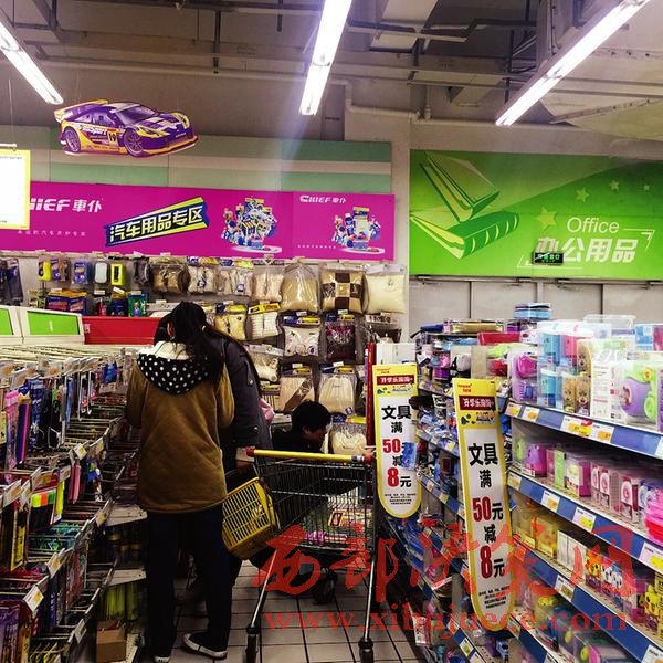 昨日記者在和平門外一超市二樓看到,入口處擺滿了本子、文具盒、書包等學習用具,“開學樂淘淘”的宣傳海報有“買50元,減8元”的優(yōu)惠活動。