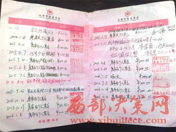 從賑災(zāi)捐款,到為愛(ài)助醫(yī),從公眾熟知的“提燈女孩”王思培,到無(wú)人注意的早產(chǎn)雙胞胎,成都慈善總會(huì)為廖弟友發(fā)放的捐款證書(shū)上,每一頁(yè)都記著受助者的名字和個(gè)人基金的用途。翻看捐款證書(shū),僅從2011年3月到2016年12月這段時(shí)間內(nèi),廖弟友的捐款次數(shù)達(dá)到58次,最近一次是2016年12月存入個(gè)人慈善基金的記錄。
