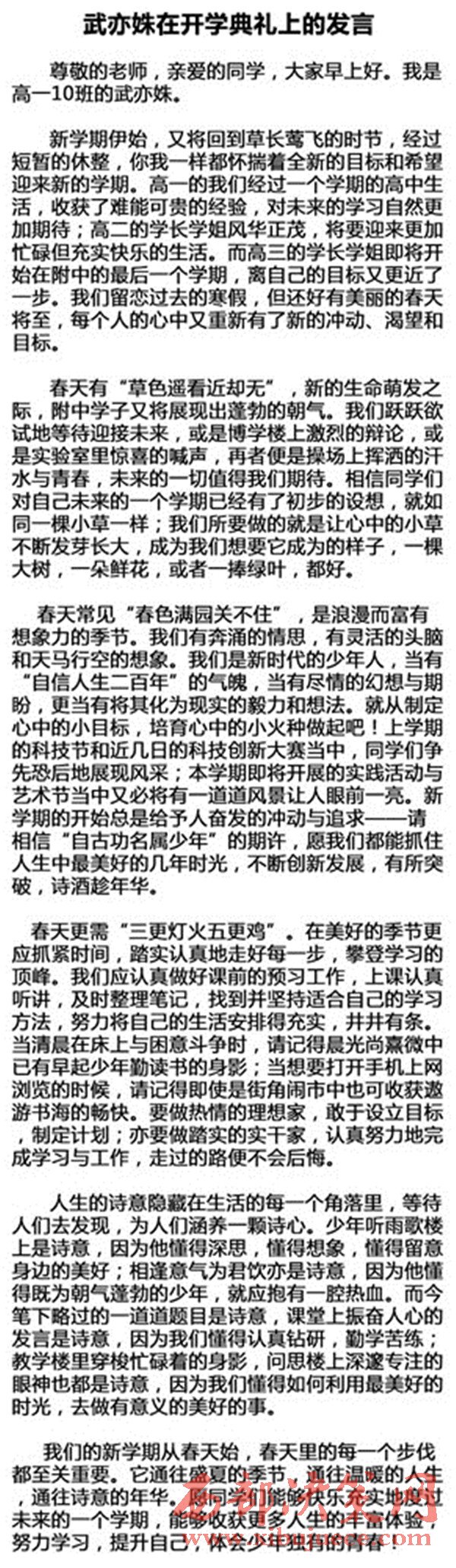據(jù)復(fù)旦附中官網(wǎng),中小學(xué)紛紛舉行開(kāi)學(xué)典禮。16日上午,復(fù)旦大學(xué)附屬中學(xué)2016學(xué)年第二學(xué)期開(kāi)學(xué)典禮隆重舉行。榮獲中央電視臺(tái)第二季中國(guó)詩(shī)詞大會(huì)全國(guó)總冠軍的文理學(xué)院學(xué)生武亦姝上臺(tái)發(fā)言。