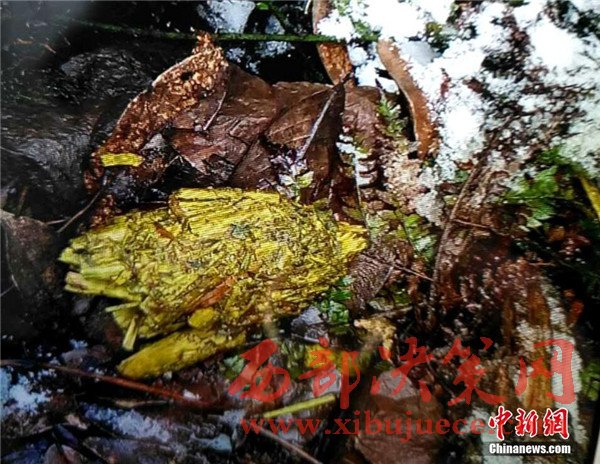 圖為馬邊縣林業(yè)工作人員在發(fā)現(xiàn)野生大熊貓附近雪地,找到新鮮的熊貓糞便。