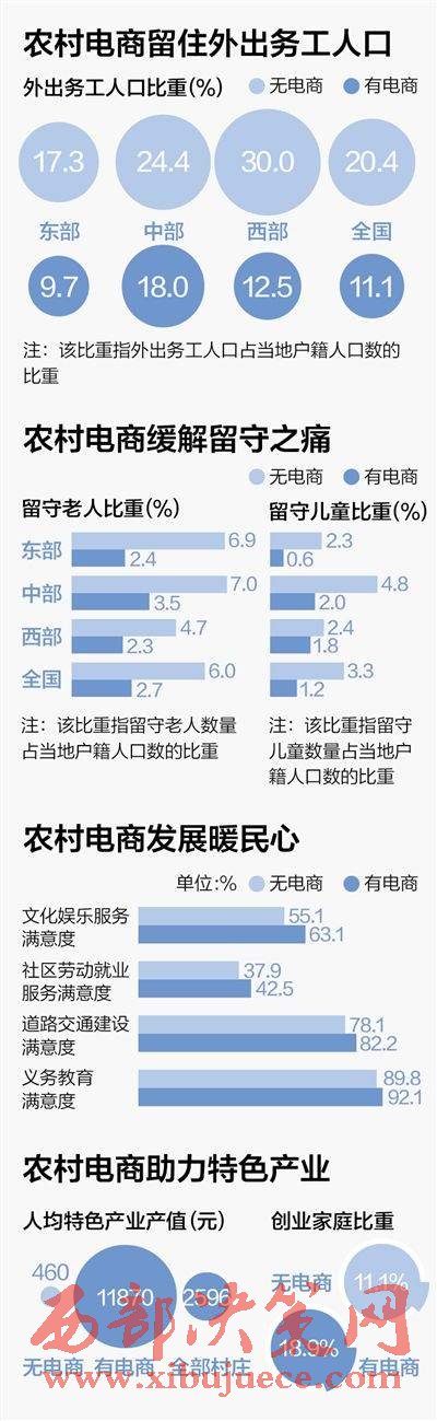 數(shù)據(jù)顯示:有電商村莊的留守老人和留守兒童的比重不到無電商村莊的一半;有電商村莊的村民對公共服務(wù)的滿意度更高。