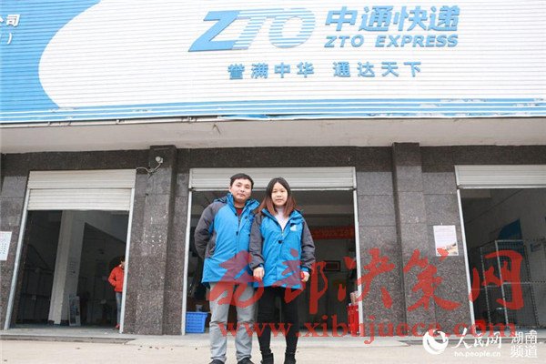 周夢(mèng)嬌和丈夫在快遞店前