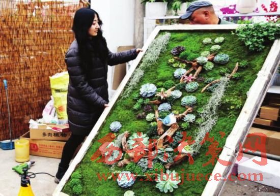 90后女孩何萌花費(fèi)一周時(shí)間用一棵棵多肉植物做成了一幅畫,畫作創(chuàng)作完成即將運(yùn)走前,就不斷有市民和網(wǎng)友前來(lái)拍照留念。