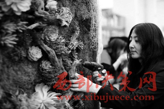 3月13日,西安北二環(huán),經(jīng)過(guò)何萌努力創(chuàng)作的這幅多肉風(fēng)景畫已經(jīng)完成。記者看到,整幅畫作高1.9米,寬1米,用60多棵多肉植物及其它綠植組合。何萌說(shuō):“我大學(xué)學(xué)的是設(shè)計(jì),畢業(yè)后做過(guò)平面設(shè)計(jì),因?yàn)橄矚g多肉植物便辭掉工作,自己開店賣多肉植物。時(shí)間長(zhǎng)了總覺(jué)得一個(gè)一個(gè)賣,不但利潤(rùn)少,也缺乏創(chuàng)意,于是就自己畫畫、寫毛筆字,以設(shè)計(jì)稿的方式完成多肉畫作的線稿設(shè)計(jì)。”從開始的組裝花盒到現(xiàn)在將多肉做成畫,何萌都全力以赴。