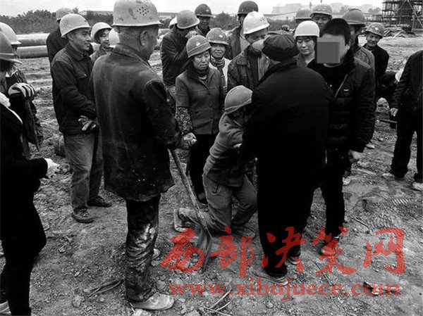 “大爺大媽,我給您跪下了,求求您們了,就讓我們干吧!”就在記者準備找工地負責人了解情況時,一男一女兩位農(nóng)民工突然撲通一聲跪倒在地,抓著其中一位老人的手哭著求情。“我們大伙都給您們跪下了,我們都是下苦人不容易……”看到有人跪地求情,其他農(nóng)民工也齊刷刷跪倒在阻擋者中的兩位老人面前,哭求開恩讓他們干活養(yǎng)家糊口。突如其來的變故,讓阻擋施工的5個人頓時慌了手腳。
