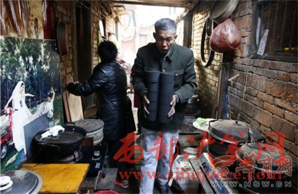 一進門,看見61歲的夏平安坐在門房里,端著個大老碗正在吃面。華商報記者問:“自己做的面?”他停止吃面,頭一抬,慢慢地說:“老板做的。”他待的是煤場門房,也是他的宿舍,屋子里靠墻擺著一張單人床,上面鋪著厚厚的被褥。院子里堆了好多已經打好的煤球。