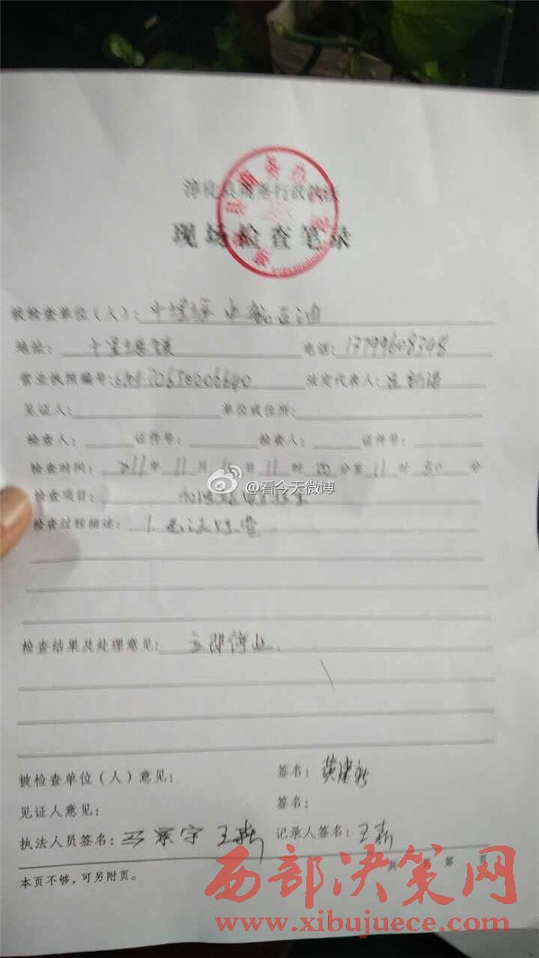 記者到淳化縣安監(jiān)局,采訪了楊副局長,他說:“我們已經讓該加油站停業(yè)了,通知他們辦理相關手續(xù)。”當記者提到此加油站還在經營時,該局長表示立馬帶人去查處,查完后給我們回復。隨后記者又來到淳化縣商務局,說明情況后,辦公室的王姓工作人員說:“我們昨天已經查處了,并且下了停業(yè)整改通知書。”記者看到檢查下發(fā)通知書上的日期,確實是11月15日。