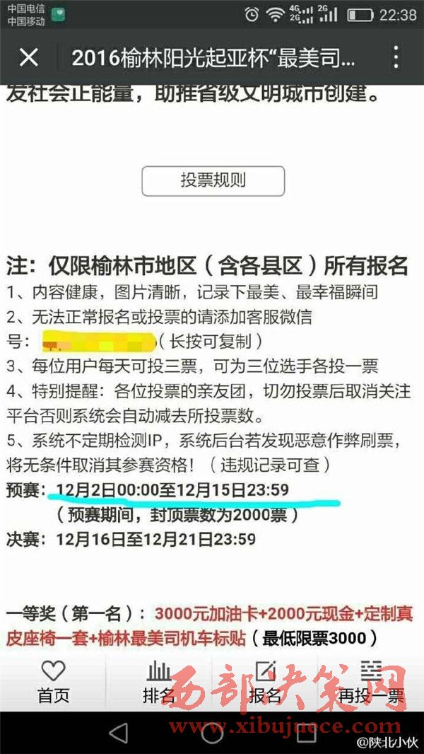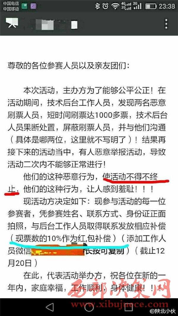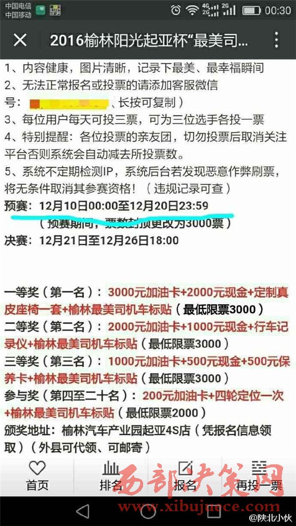 2016年12月初,榆林陽光汽貿(mào)通過某公眾號發(fā)起2016榆林陽光起亞杯“最美司機”評選活動,活動設置了豐厚了獎品作為獎勵。并組織全民參與評選活動的投票行為。至此,在榆林眾多市民的朋友圈都發(fā)起了轉發(fā)拉票行為。然而,此次拉票行為卻不斷變更投票時間和決賽時間。近日,某公眾號發(fā)布信息,聲稱陽光汽貿(mào)組織的“最美司機”活動取消,并給予相應的票數(shù)補償。此行為卻引起眾多市民的質疑,認為陽光汽貿(mào)是在“消遣”參與投票的近萬名市民,從而變相成廣告推銷行為。究竟陽光汽貿(mào)是心疼評選活動的獎品發(fā)放,還是一種涉嫌商業(yè)的欺詐行為,請@榆林工商 ,根據(jù)《消費者權益保護法》予以重查重處。