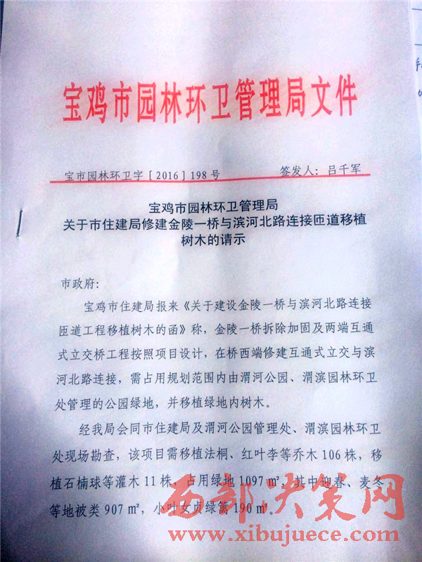 2月23日,本網(wǎng)工作人員來到了寶雞市園林環(huán)衛(wèi)管理局了解情況,綠化科張女士拿出了寶雞市園林環(huán)衛(wèi)局2016年11月30日上報寶雞市人民政府‘寶市園林環(huán)衛(wèi)字【2016】198號文件‘,內(nèi)容是“關(guān)于市住建局修建金陵一橋與濱河北路連接匝道移植樹木“的請示報告。報告顯示項目需要移植法桐、紅葉李、喬木等106株,移植石楠球等灌木11株。但該報告未顯示需要砍伐樹木。