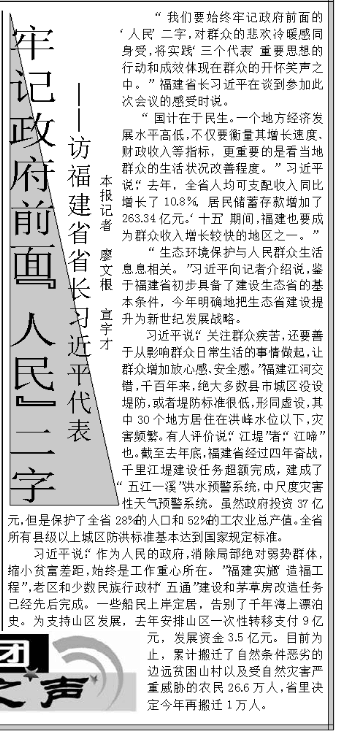 “我們要始終牢記政府前面的‘人民’二字,對群眾的悲歡冷暖感同身受。”2002年3月4日,人民日報兩會特刊的“代表團(tuán)之聲”欄目里,刊發(fā)了對時任福建省省長的習(xí)近平代表的采訪,標(biāo)題是《牢記政府面前“人民”二字》。