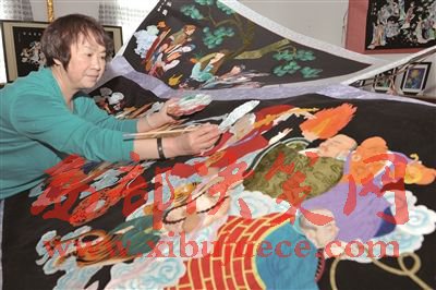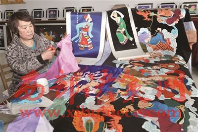 現(xiàn)任青海省民間工藝美術大師、國家非物質文化遺產(chǎn)湟中堆繡的青海省代表性傳承人、湟中縣堆繡協(xié)會會長的喬應菊,自幼酷愛民間工藝,三十年前經(jīng)塔爾寺三絕藝術之一的堆繡老藝僧智華恩師的傳授,她執(zhí)著追求,苦學至今,形成了她特有的堆繡造型和配色特色。她對記者說:“堆繡是一種運用‘剪’、‘堆’技法塑造的獨特藝術,用各色質地不同的綢緞剪出人物、花鳥、山水等各種圖案,再根據(jù)設計需求逐一堆貼在黑色底子的大幅布幔上,形成了一個完整的畫面。堆繡分為‘平剪堆繡’和‘立體堆繡’,前者是將各色布料堆貼在事先設計好的圖案上,用彩線或金銀線鑲邊而成;后者則是用各色綢緞剪成佛像、人物、花卉等多種圖形,然后充塞羊毛或棉花,再用絲線繡織。堆繡整體圖案極富有立體感,人物形象逼真,畫面色調(diào)和諧,產(chǎn)生出豐富而生動的立體感和織物特有的肌理感,具有浮雕式的藝術效果,深受人們的喜愛”。